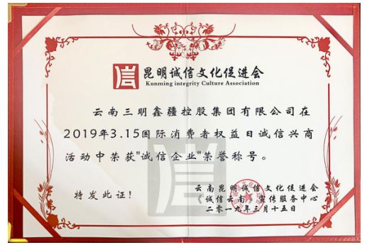 荣获云南昆明诚信文化促进会“诚信企业”称号